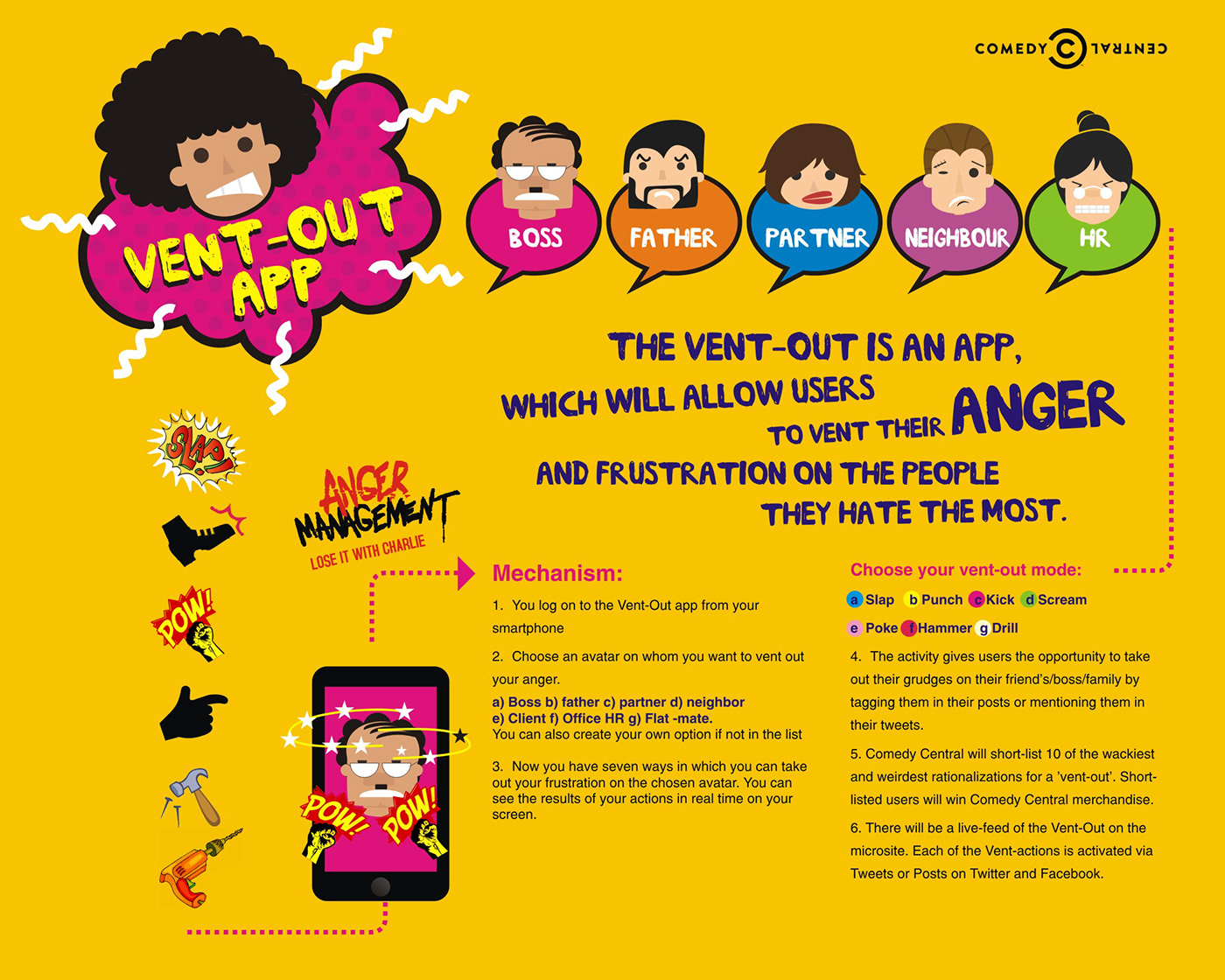 The Vent Out App was a unique digital activation inspired by Anger Management, letting fans "scream it out" in virtual therapy sessions. This interactive concept connected users directly to the show’s essence, blending humor and emotional release into a memorable, engaging experience.