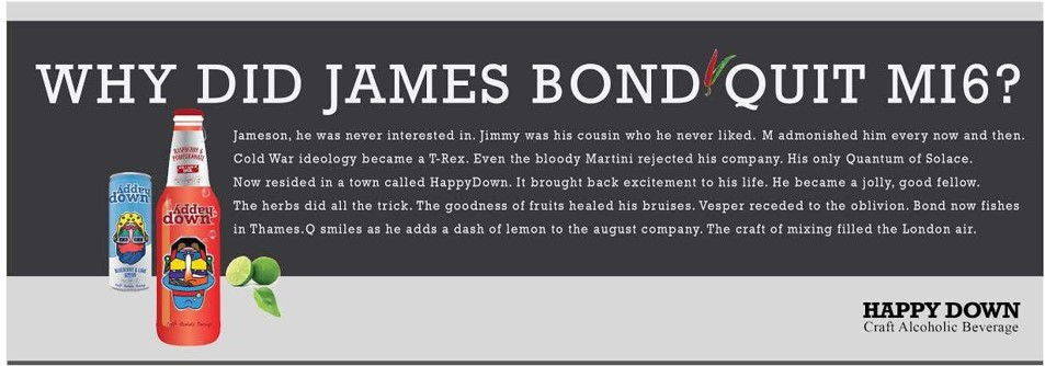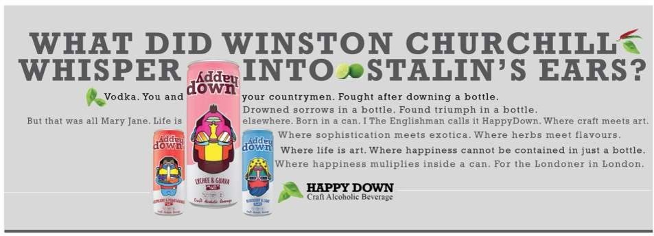 Happy Down. Beautifully crafted cocktails infused with fruits, packed in a can, so you’re never without one, when you truly need it. It’s artisanal, it’s vegan, it’s downright sexy, it’s a ticket to cocktail town for the Londoners. The posters use references of United Kingdom and how the drink has made a way into the lives of those who hate sugary and pulpy thingies –with quirky graphics and storytelling, just like the name.